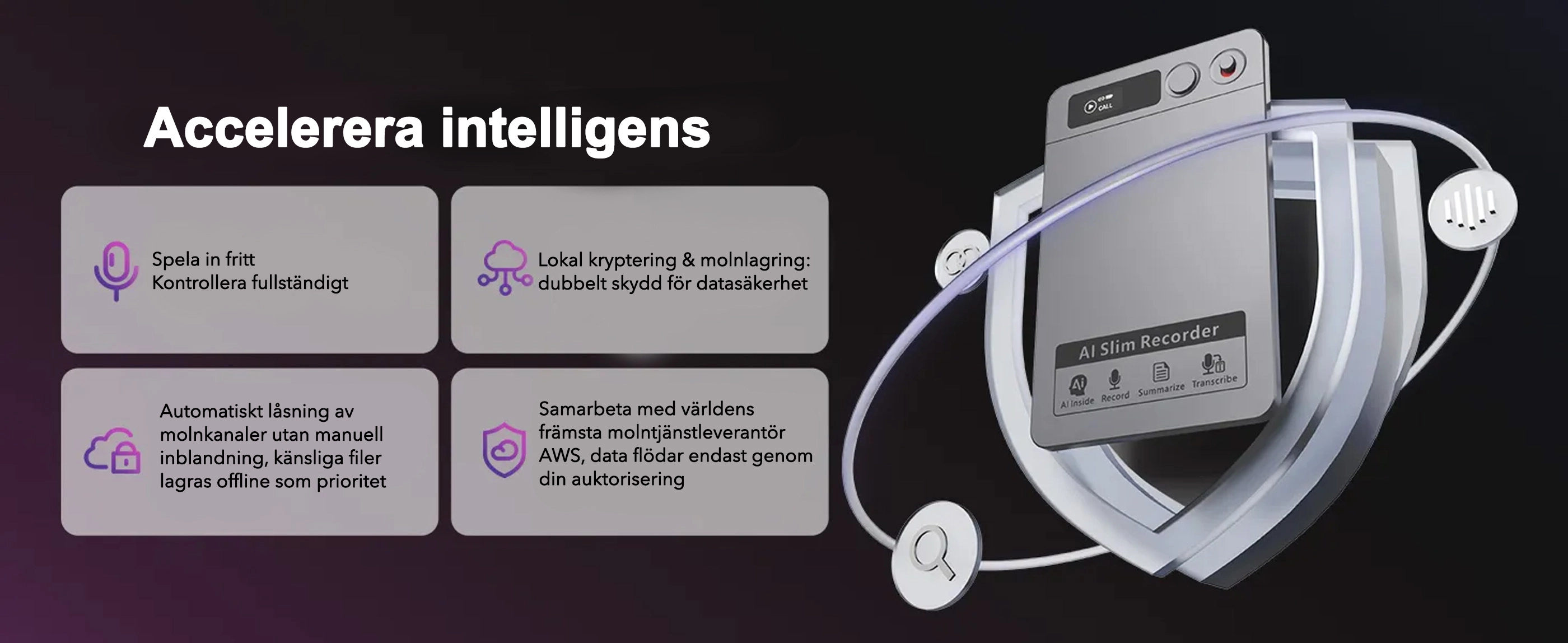 Inspelaren levereras med 64GB lagringsutrymme, kapabel att lagra över 500 timmar ljud lokalt. Dina data skyddas med militärgradig krypterad molnsäkerhetskopiering, vilket håller dem säkra och tillgängliga globalt.